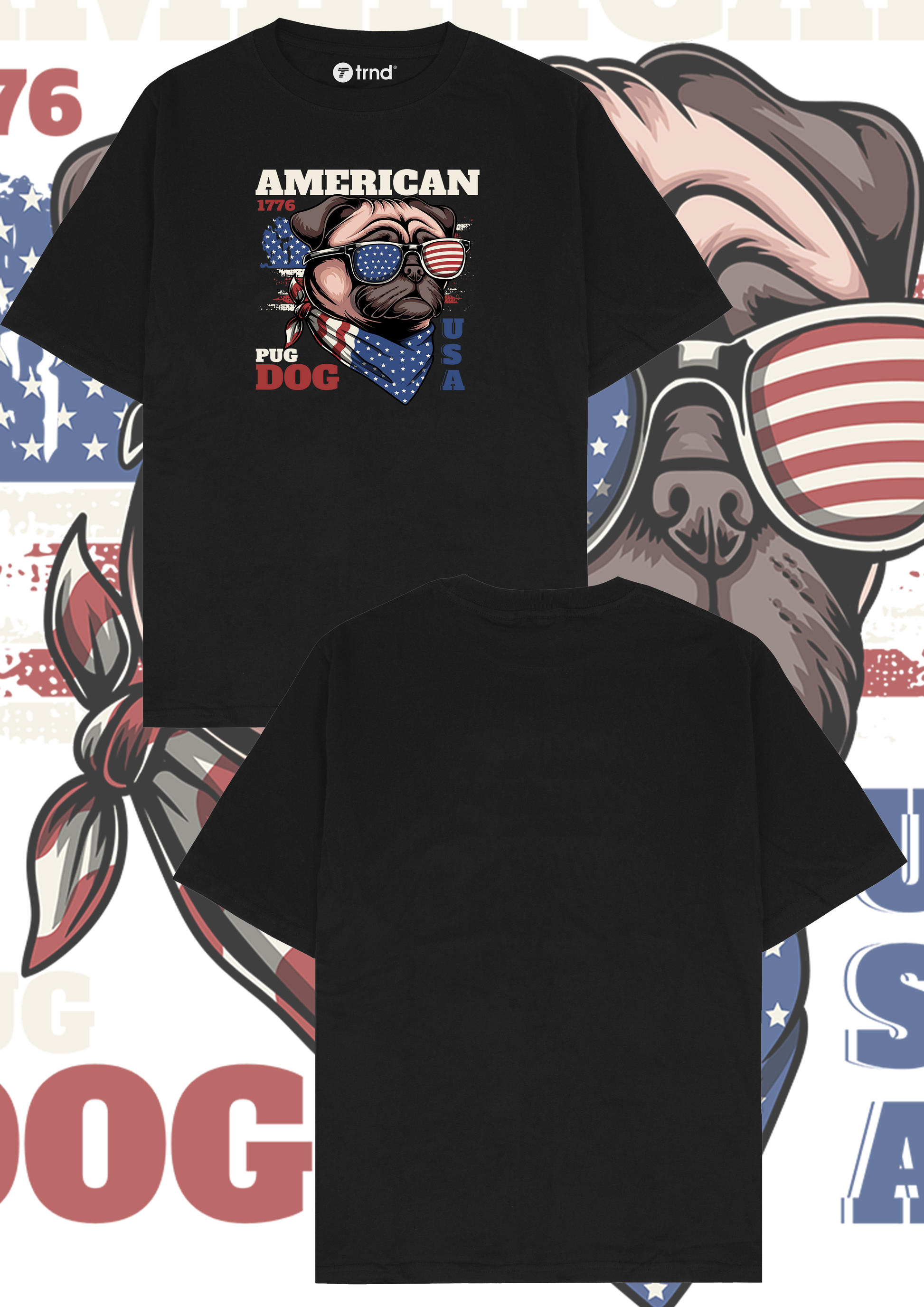 Discover the "American Pug Dog" t-shirt, a patriotic black tee featuring a cool pug wearing sunglasses and an American flag bandana, exuding a fun, rebellious vibe. With bold red, white, and blue graphics and the year "1776," this retro-inspired, patriotic apparel captures the spirit of American pride. Perfect for dog lovers and fans of unique, statement-making fashion, this trendy shirt is ideal for standing out at any event or casual outing.