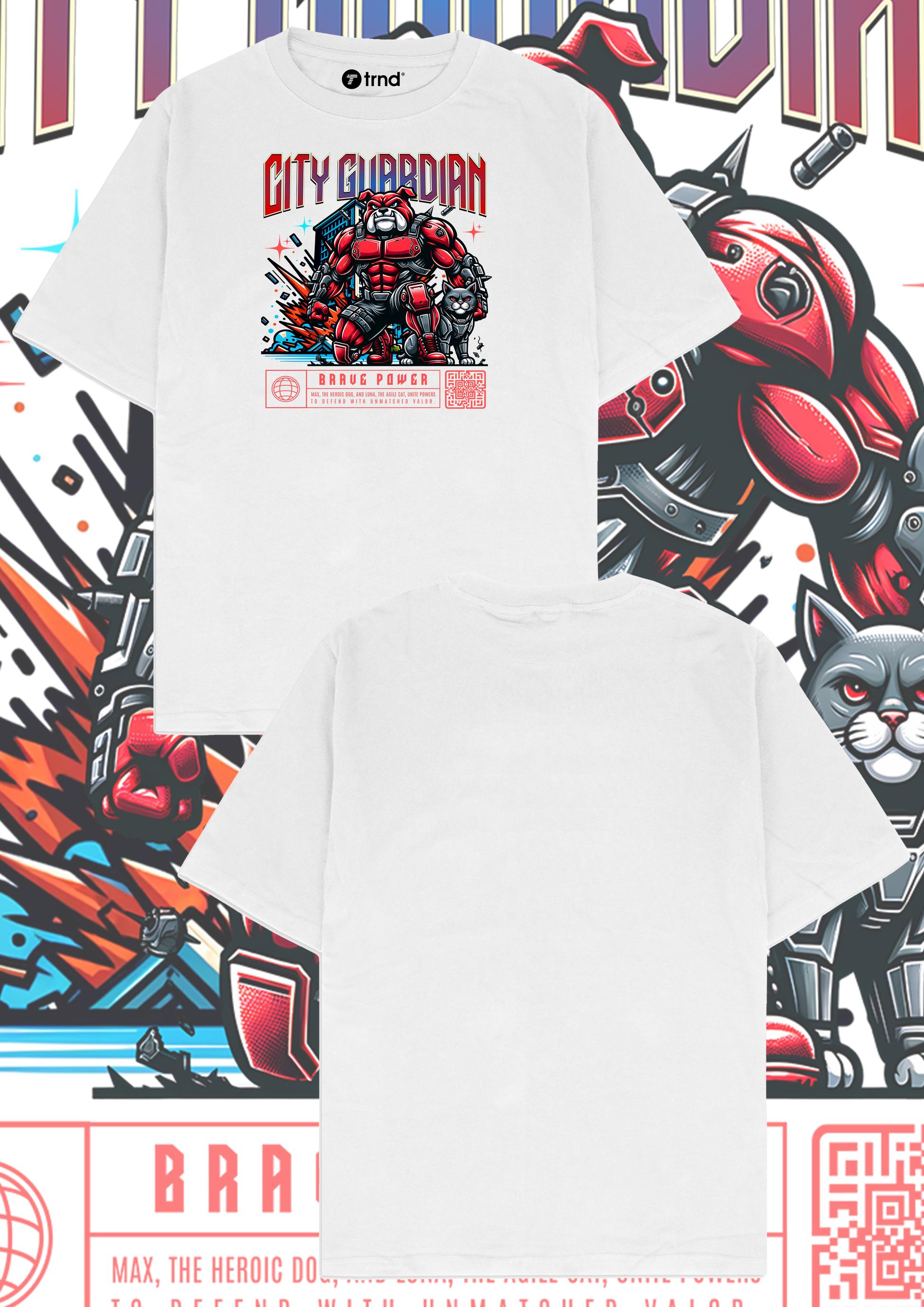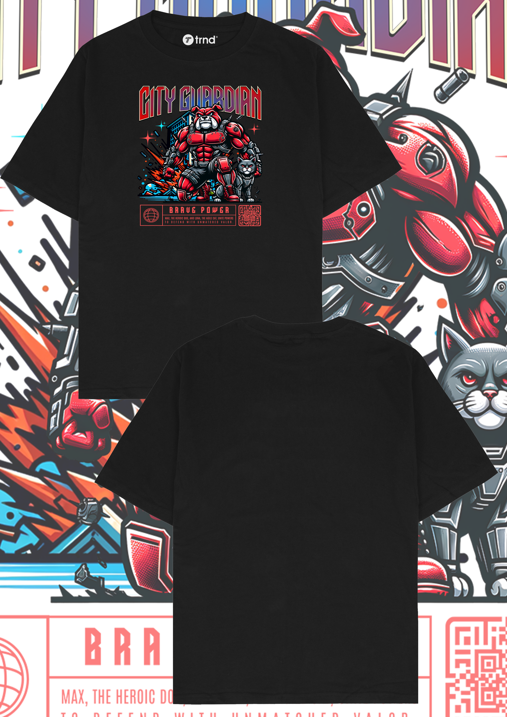 Discover the bold 'City Guardian' t-shirt by Trnd, featuring a striking graphic of a powerful bulldog in robotic armor, standing alongside a fierce cat, ready to defend with unmatched valor. Available in classic white and sleek black, this eye-catching design showcases vibrant colors, dynamic explosions, and futuristic cityscapes. Perfect for fans of urban streetwear and superhero-inspired fashion. Shop now for a trendy, high-quality t-shirt that combines brave power with stylish street art vibes