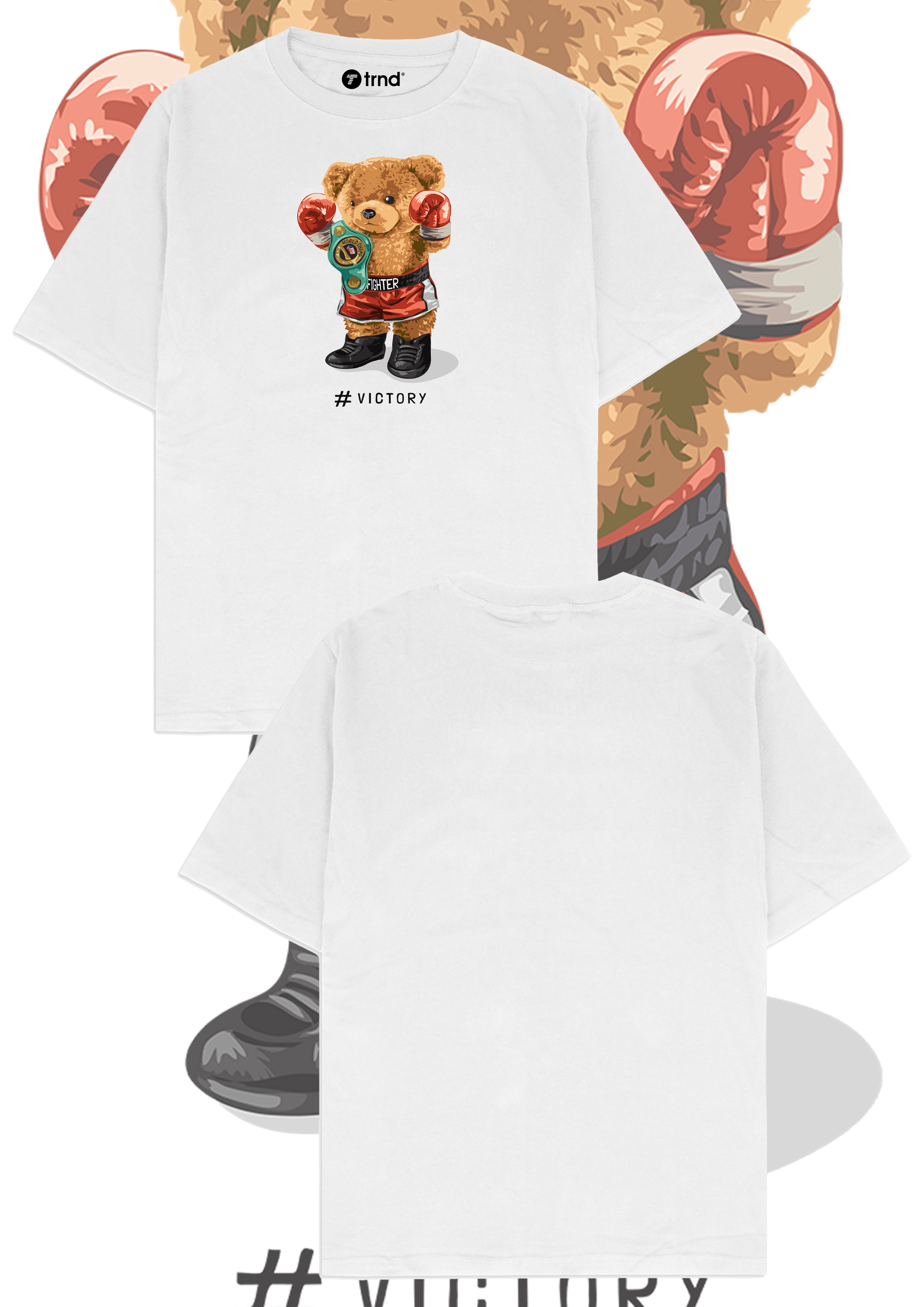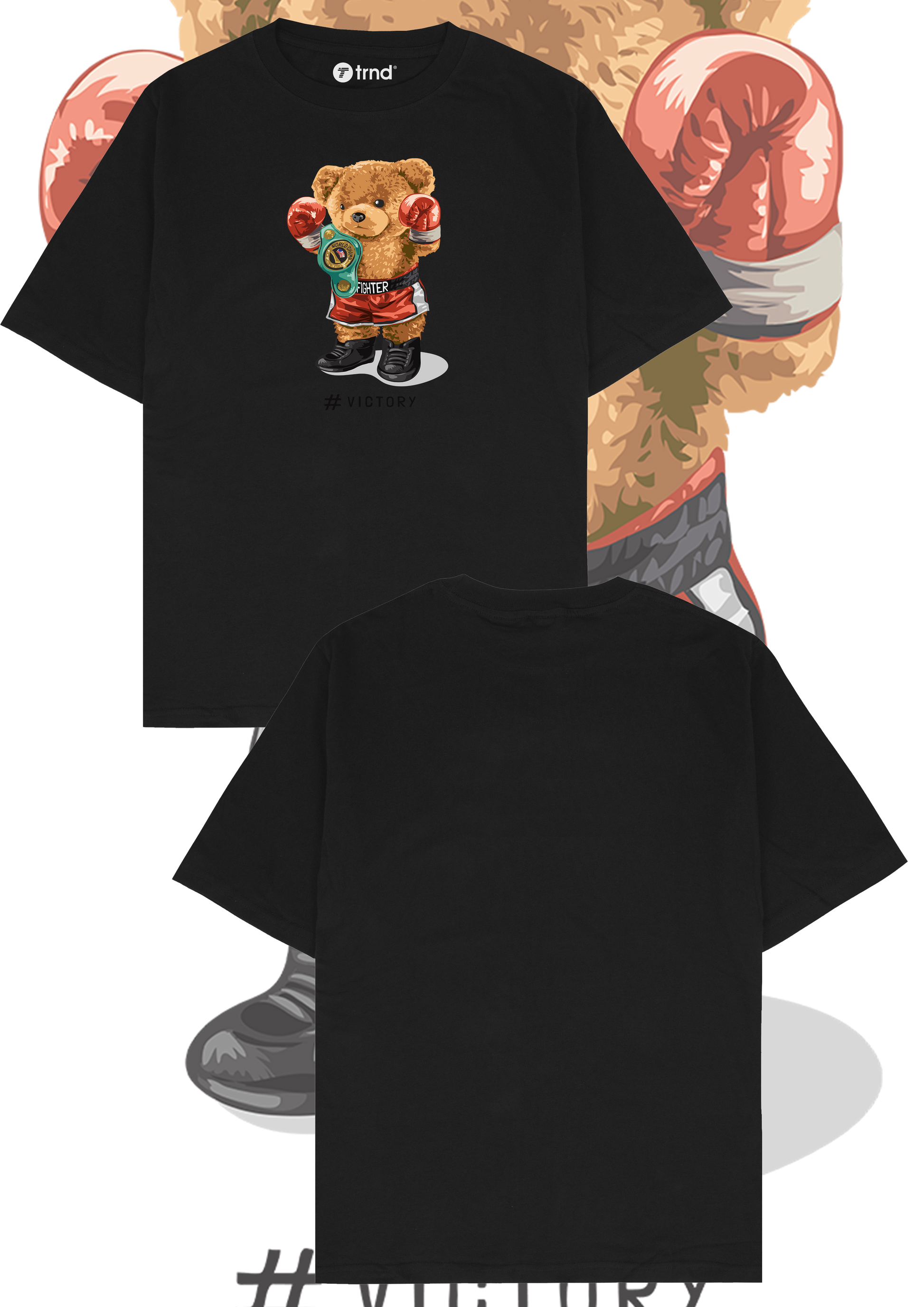Elevate your street style with this black 'Fighter Bear' t-shirt from trnd, featuring a bold teddy bear graphic in boxing gear with red gloves and a championship belt. The #VICTORY text adds a winning vibe to this casual graphic tee, perfect for everyday wear. Shop now for this unique street wear piece that blends cute and fierce!