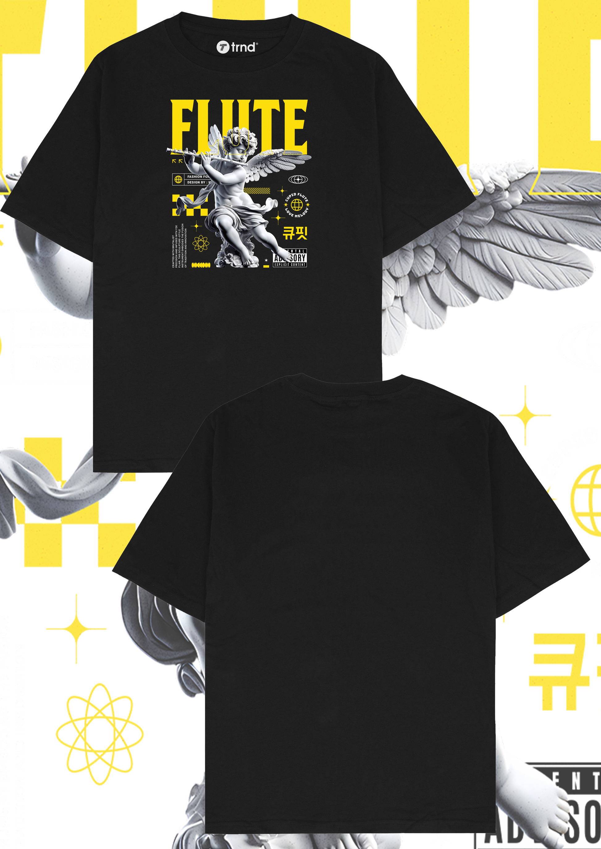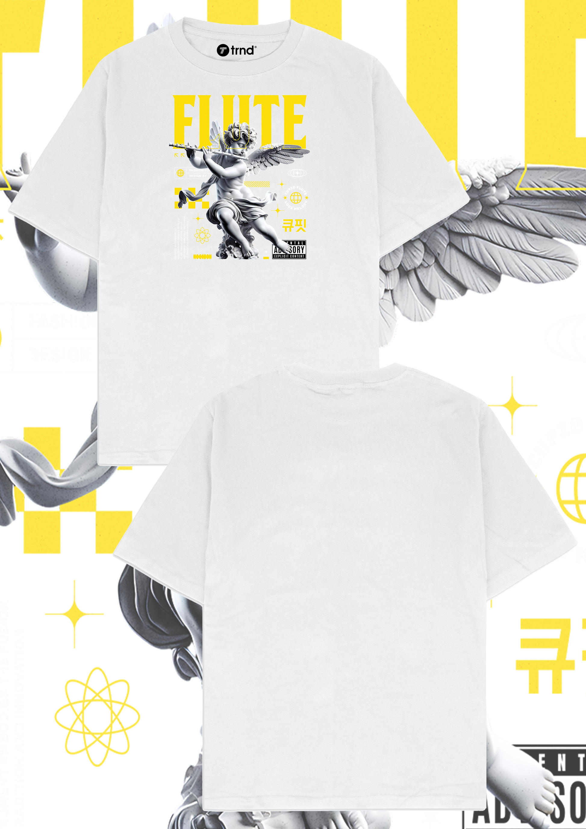 Embrace bold style with the "Flute" t-shirt by trnd, featuring a striking graphic of a cherubic statue playing a flute, highlighted with vibrant yellow text and artistic elements. This unique design blends classical art with modern streetwear vibes, perfect for those who love to stand out. Crafted for comfort and style, this 2025 fashion piece is ideal for casual outings. Shop now for a fresh addition to your wardrobe!