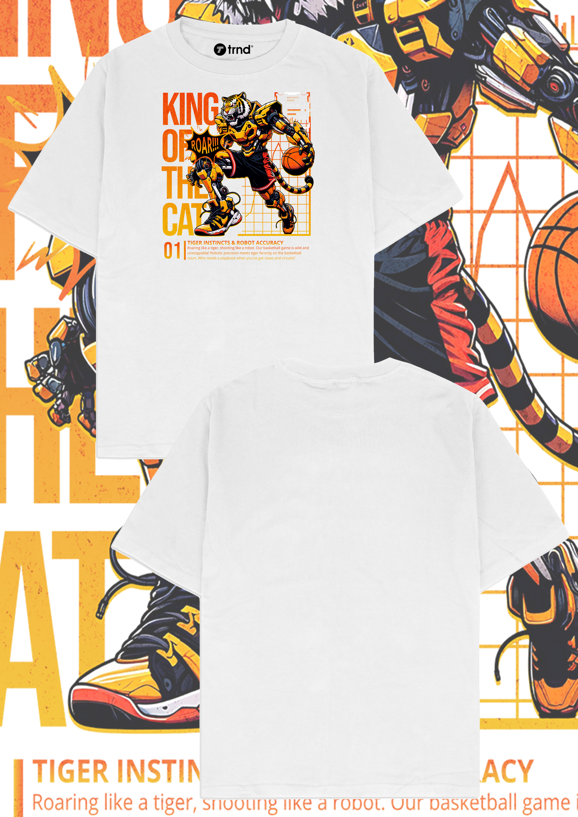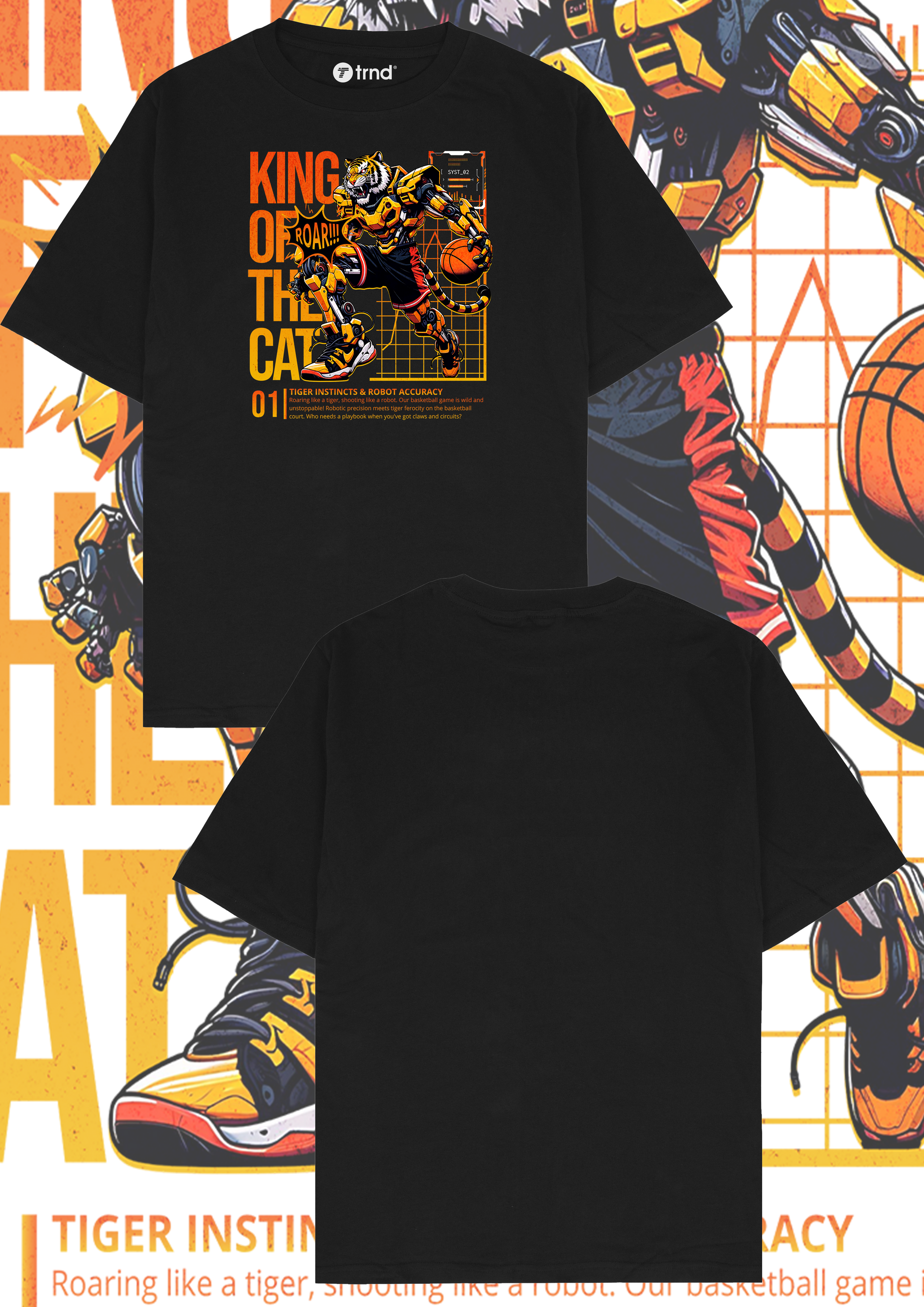 Discover the "King of the Cat" t-shirt, featuring a striking design of a robotic tiger in a dynamic basketball pose. This black t-shirt showcases bold orange and yellow graphics, blending futuristic robot elements with fierce tiger instincts. Perfect for basketball fans and pop culture enthusiasts, the shirt highlights "Tiger Instincts & Robot Accuracy" with a vibrant, high-tech aesthetic. Shop now for a unique, eye-catching addition to your wardrobe!