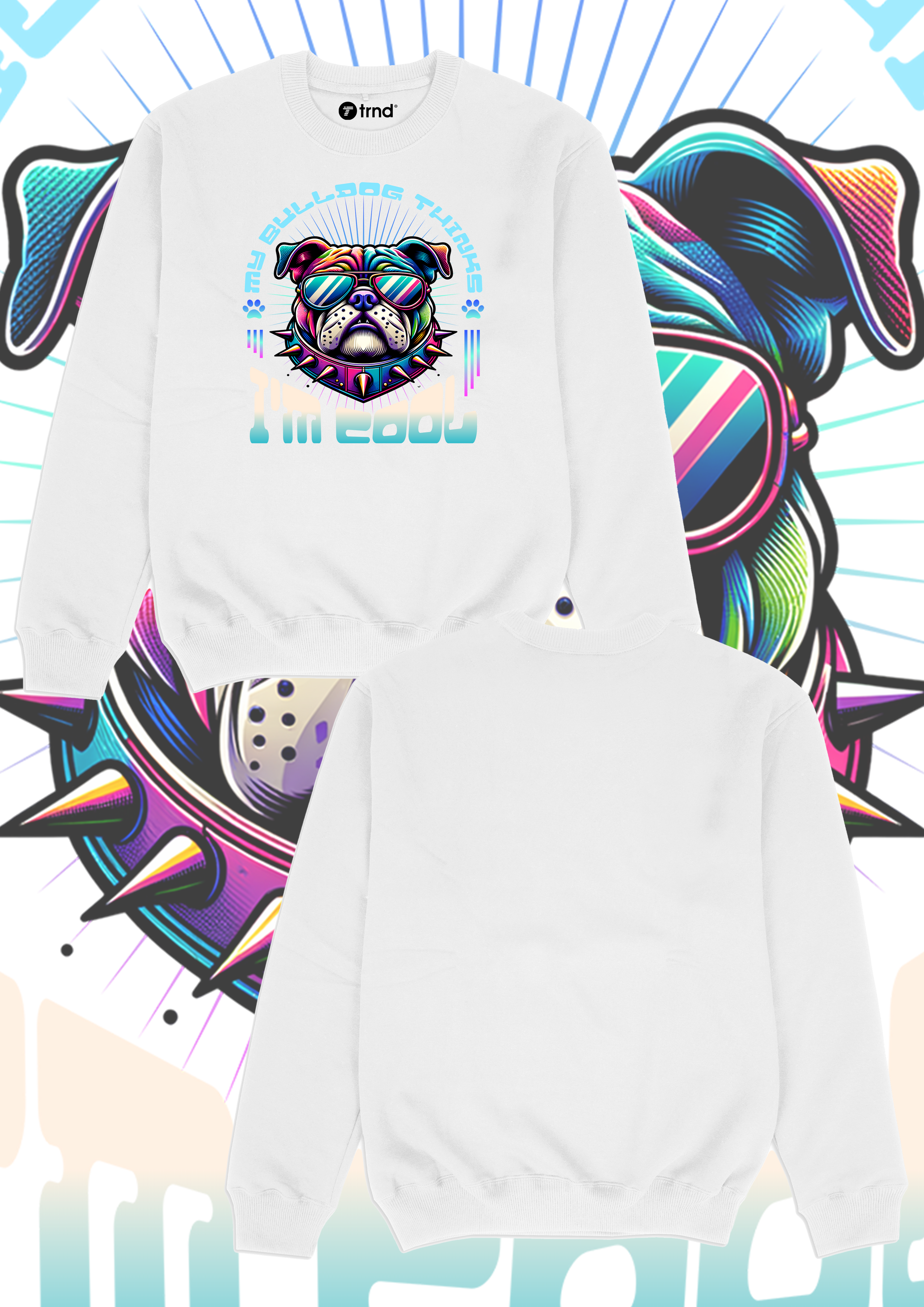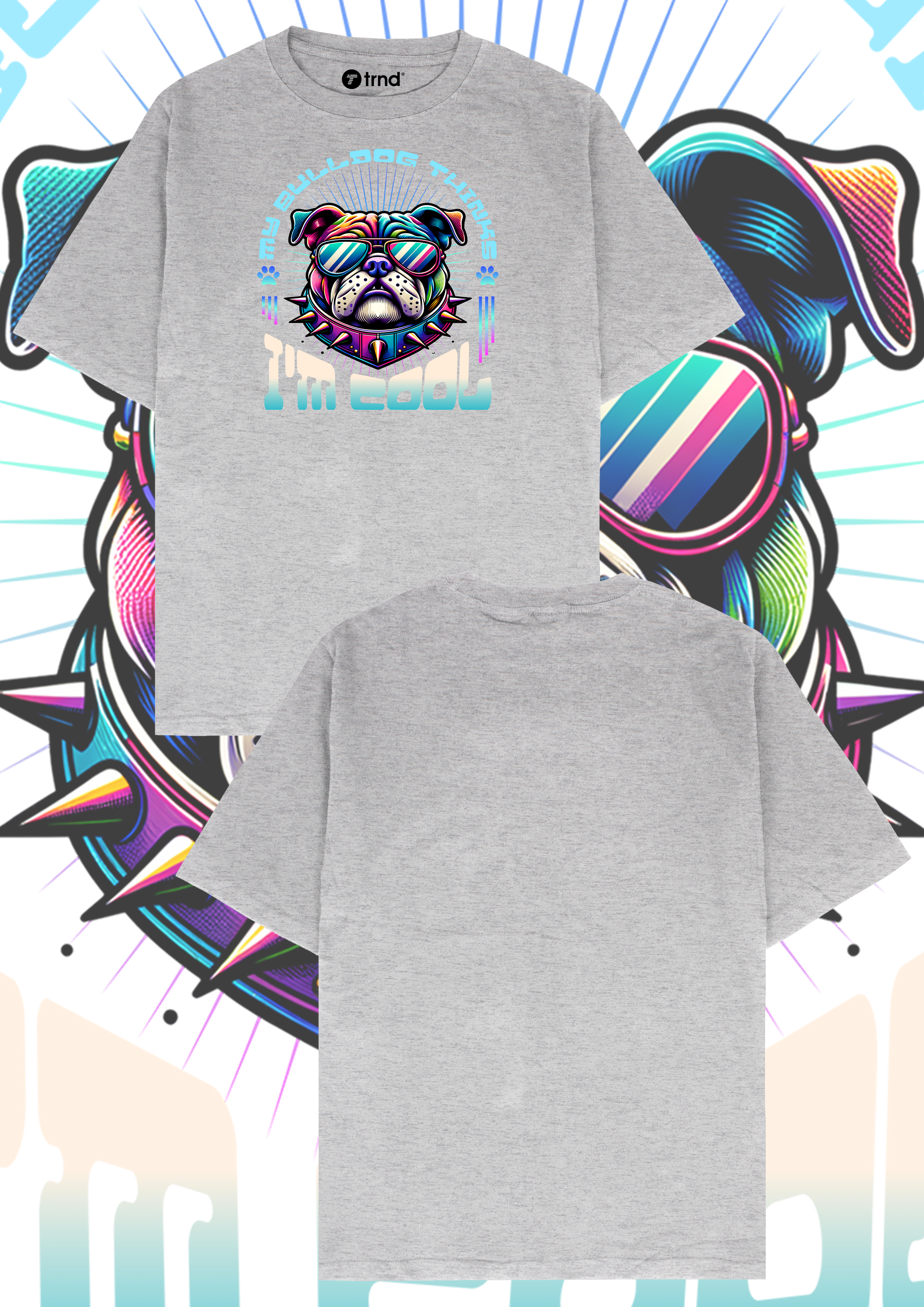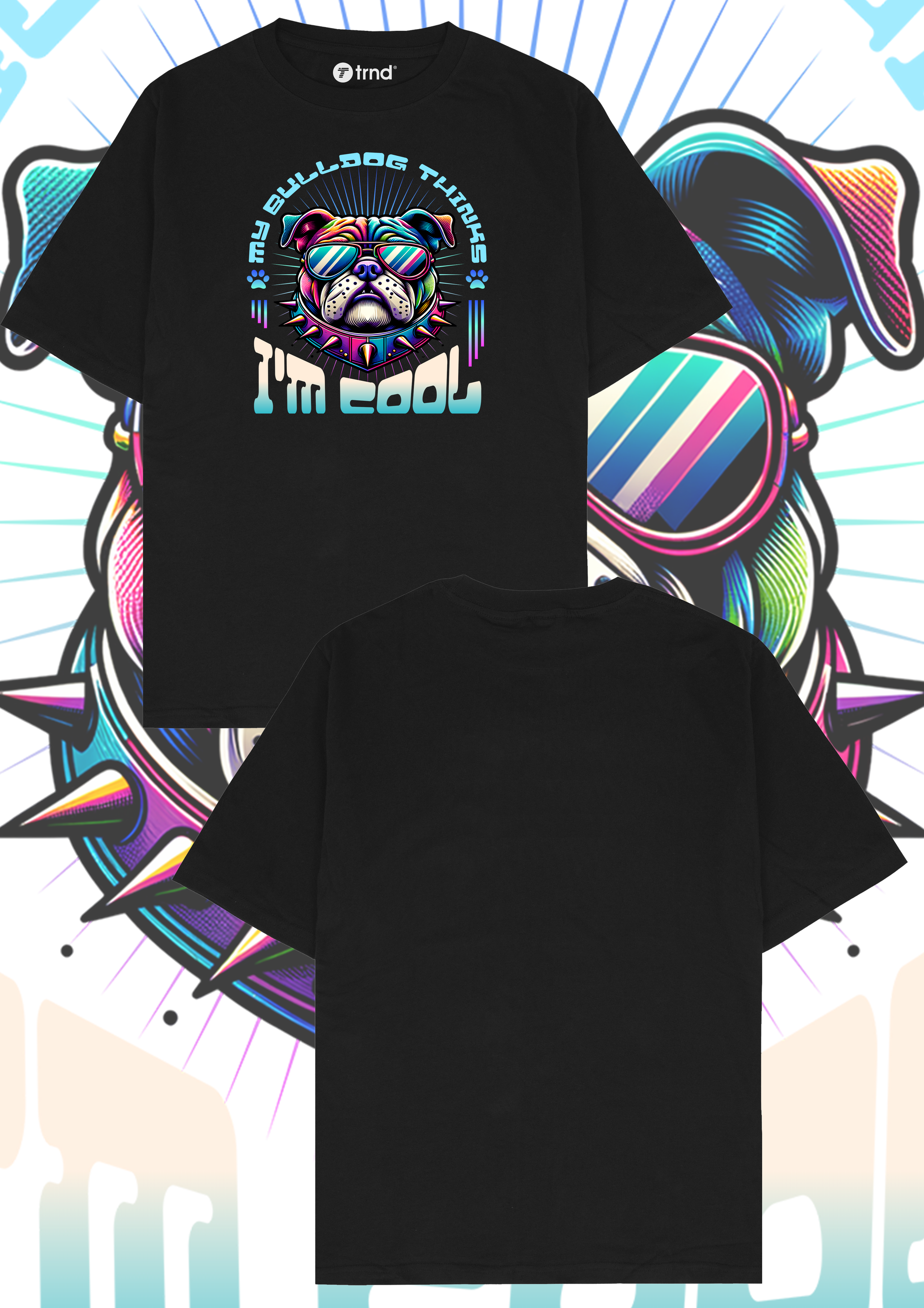 Rock the 'My Bulldog Thinks I'm Cool' hoodie by Trnd, featuring a vibrant, retro-futuristic design of a stylish bulldog wearing sunglasses and a spiked collar, surrounded by neon colors and dynamic patterns. This white hoodie combines comfort with bold streetwear aesthetics, perfect for dog lovers and trendsetters alike. Ideal for casual wear, this eye-catching graphic hoodie showcases a playful, cool vibe with a modern twist. Shop now for a trendy, high-quality addition to your wardrobe!