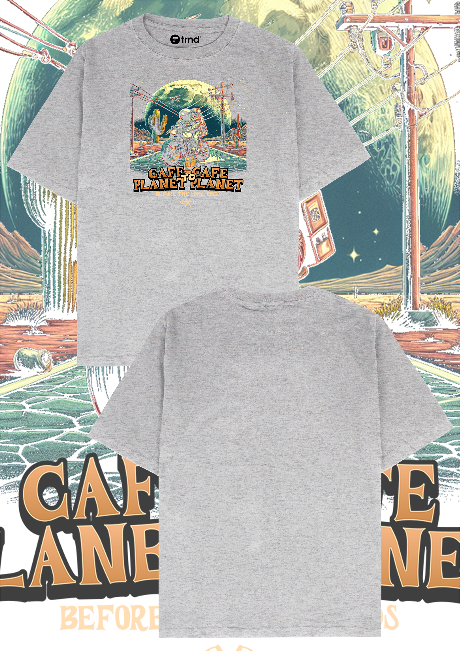 Embark on a cosmic adventure with TRND’s "Cafe & Planet" t-shirt. This stylish grey tee features a captivating graphic of an astronaut riding a motorcycle across a desert landscape under a moonlit sky, with the tagline "Cafe & Planet Before the Sun Sets." Crafted from 100% premium cotton, it offers soft, durable comfort perfect for space lovers or casual wear.