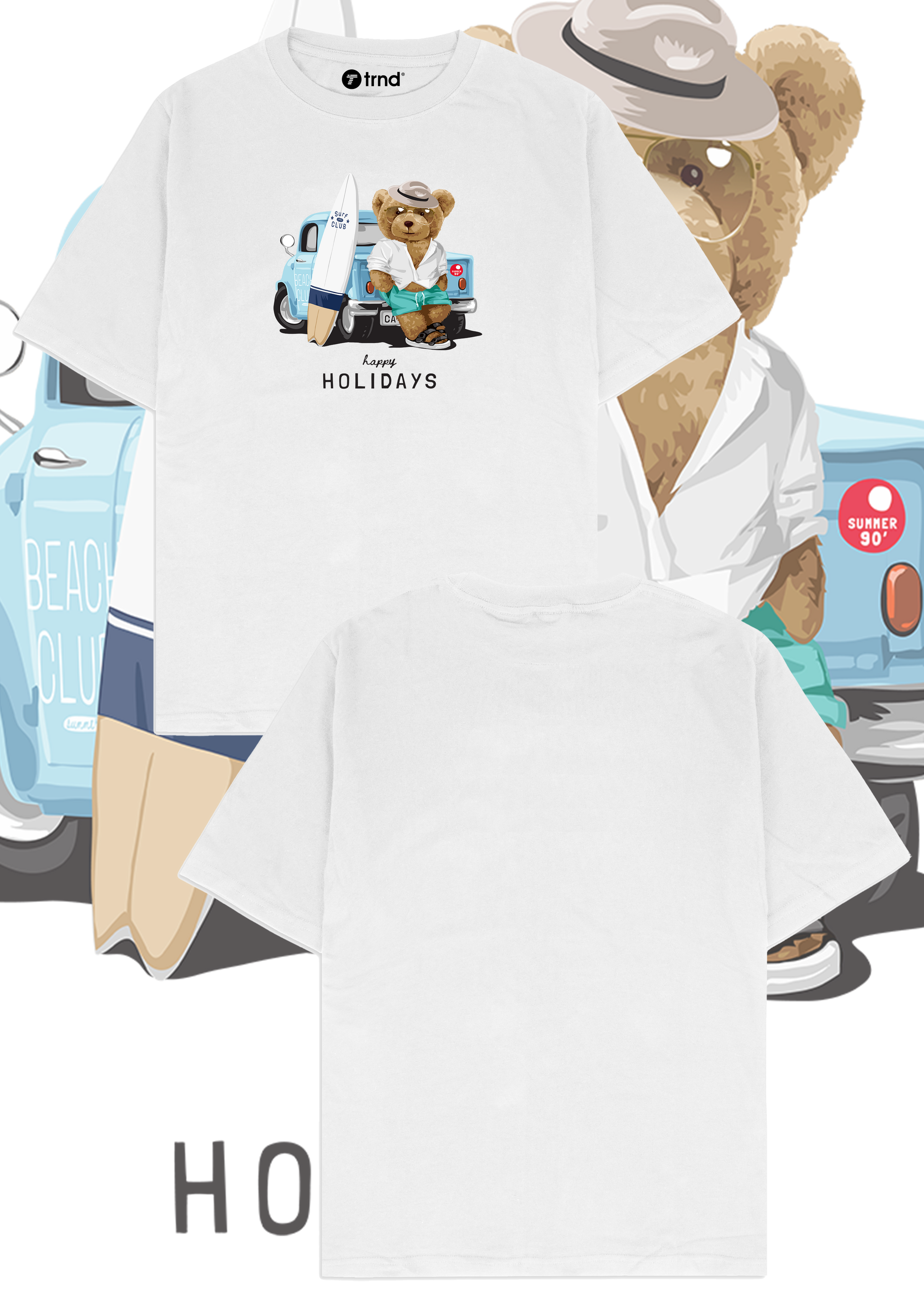 Embrace the summer vibes with this white 'Happy Holidays' t-shirt from trnd, featuring a stylish teddy bear in sunglasses and a hat, lounging with a surfboard on a blue beach van. Ideal for beach lovers and street wear enthusiasts, this graphic tee captures a carefree holiday spirit. Shop now for this fun, seasonal design!